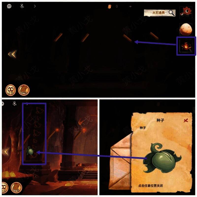 3.用【火石道具】点燃四根木棍;点击获取【种子】(注意柱子上的鸟图案:从上到下-大小大大小小大)