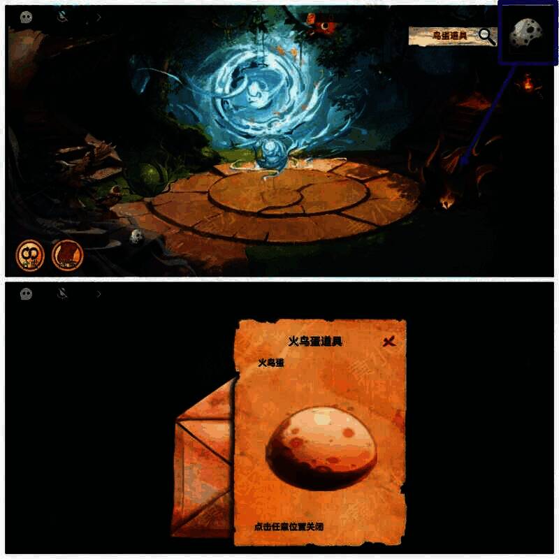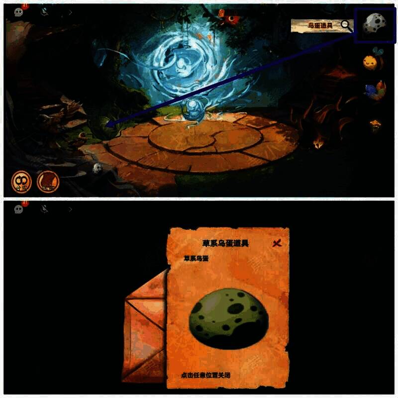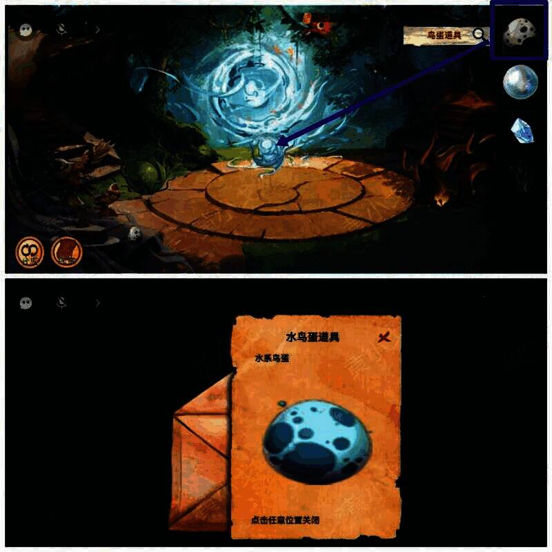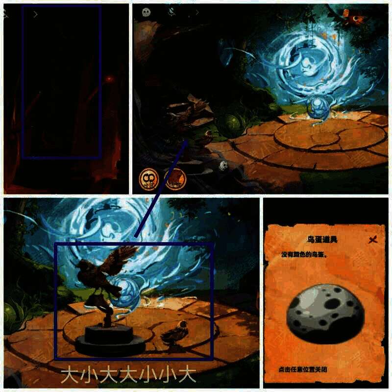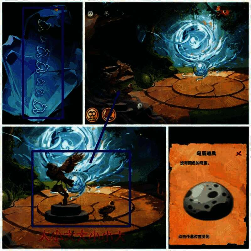 7.点击鸟雕像,根据水晶上的鸟图案,按(大小大大小小大)的顺序点击鸟雕像,获得【鸟蛋道具】