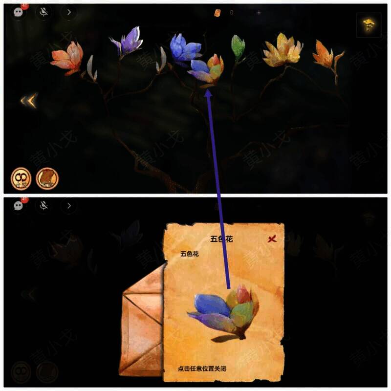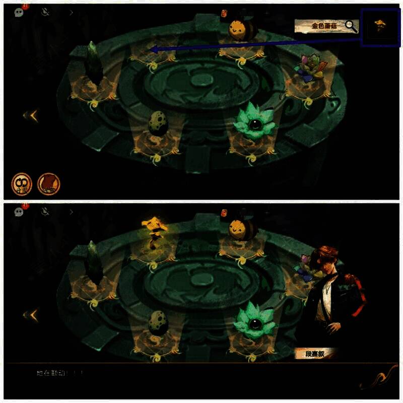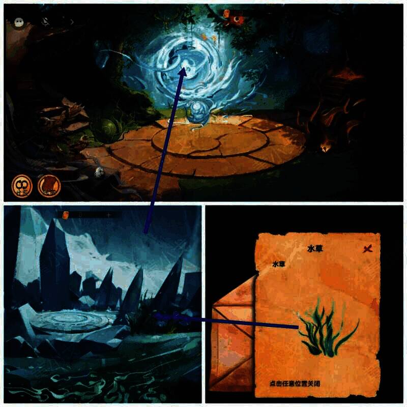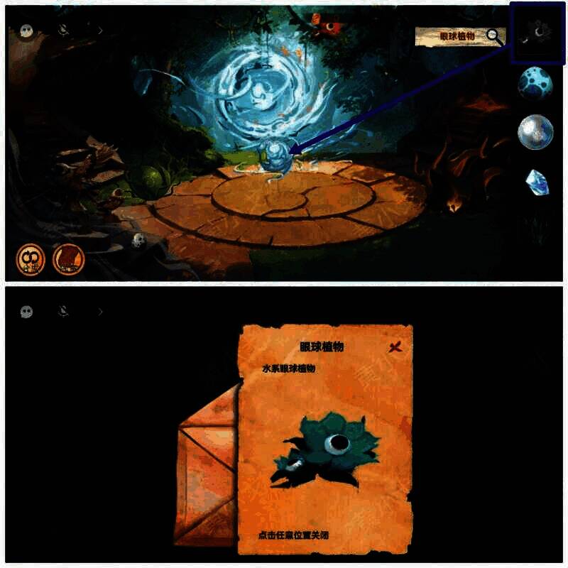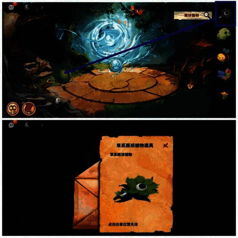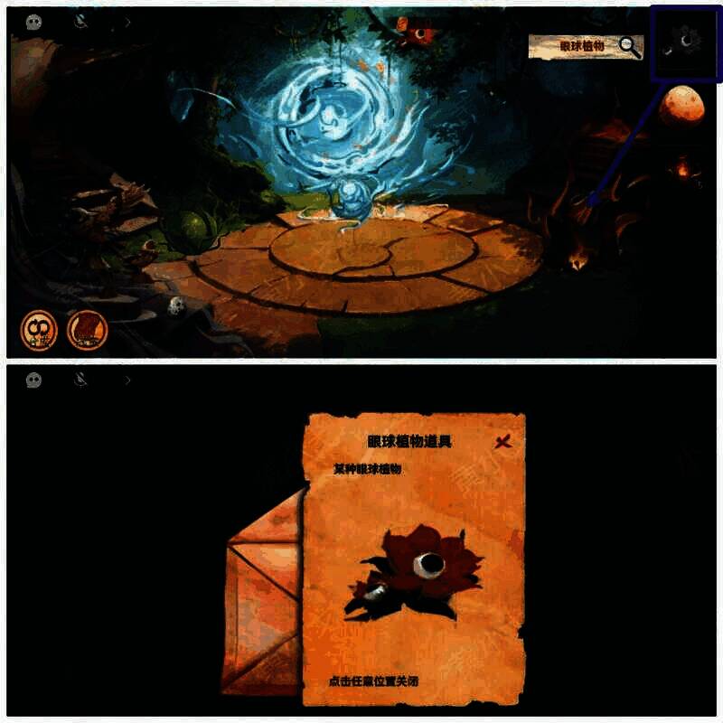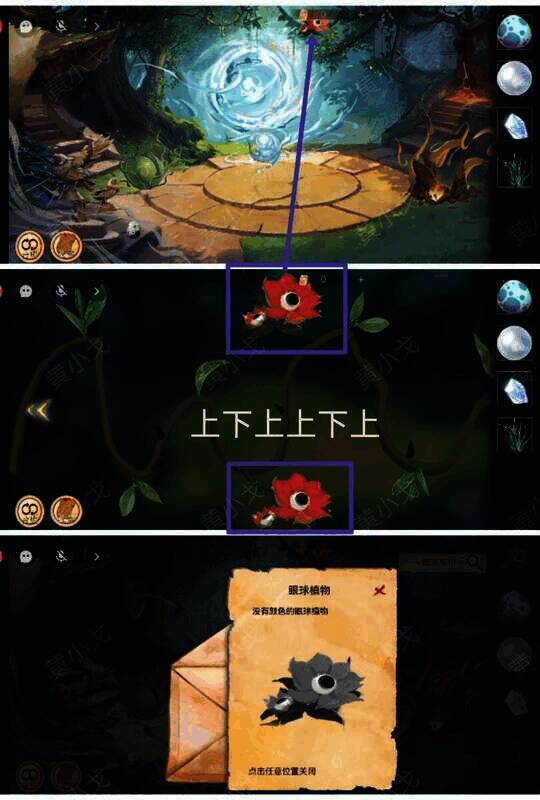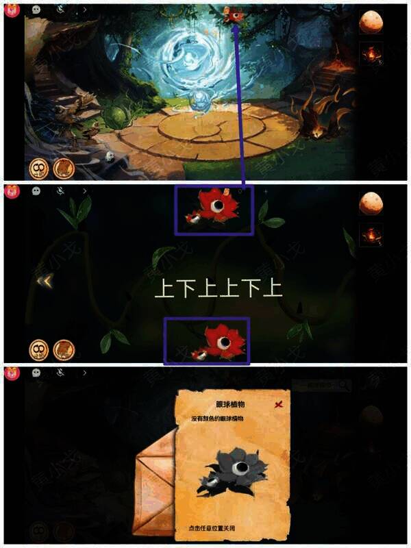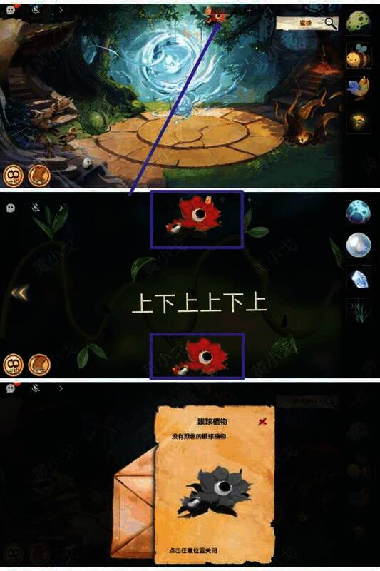 10.点击藤蔓上的迁瞳花,按(上下上上下上)的顺序点击迁瞳花(使所有的叶子消失),获得【眼球植物】