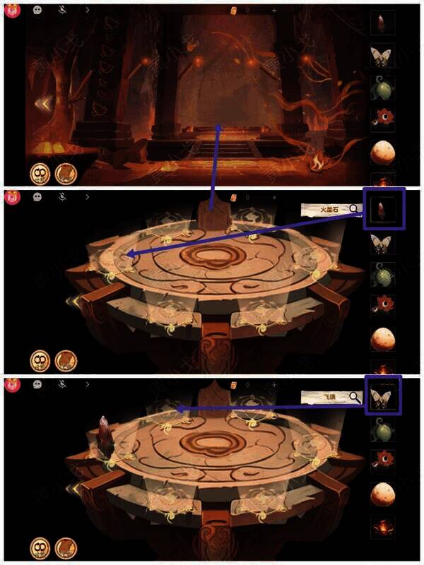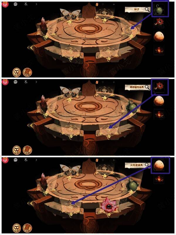10.点击祭台,放上【火晶石】、【飞蛾】、【种子】、【眼球植物道具】、【火鸟蛋道具】和【火石道具】