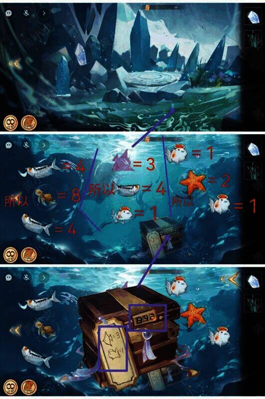5.点击池子里的箱子,根据箱子上的等式,输入密码:842