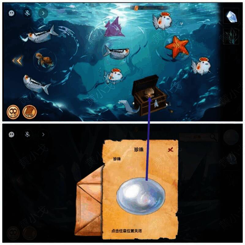 11.点击地上的罗盘,将罗盘调整到水晶、珍珠、水草、花➕水、蛋➕水后,点击中间的罗盘按钮后获得【水晶石】(根据需要收集的6种物品调整对应的图案)