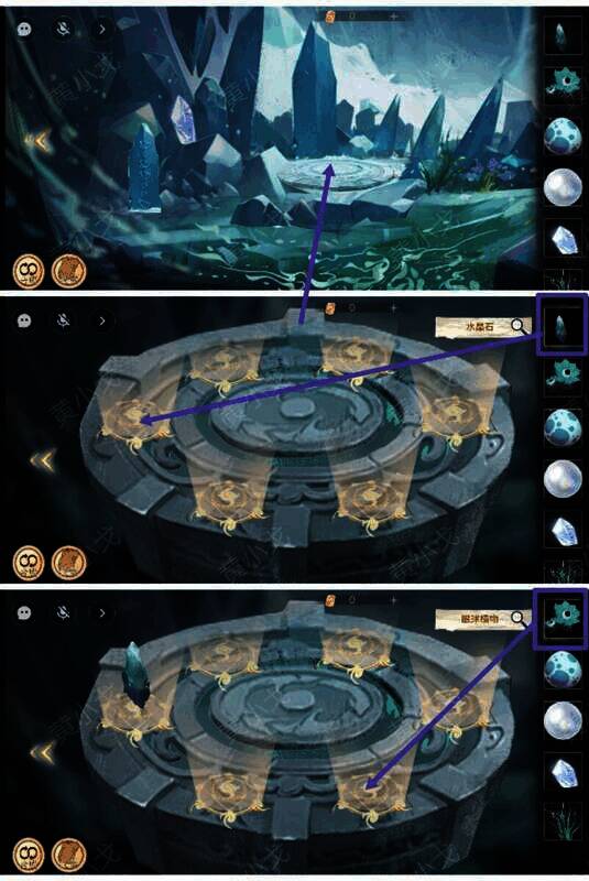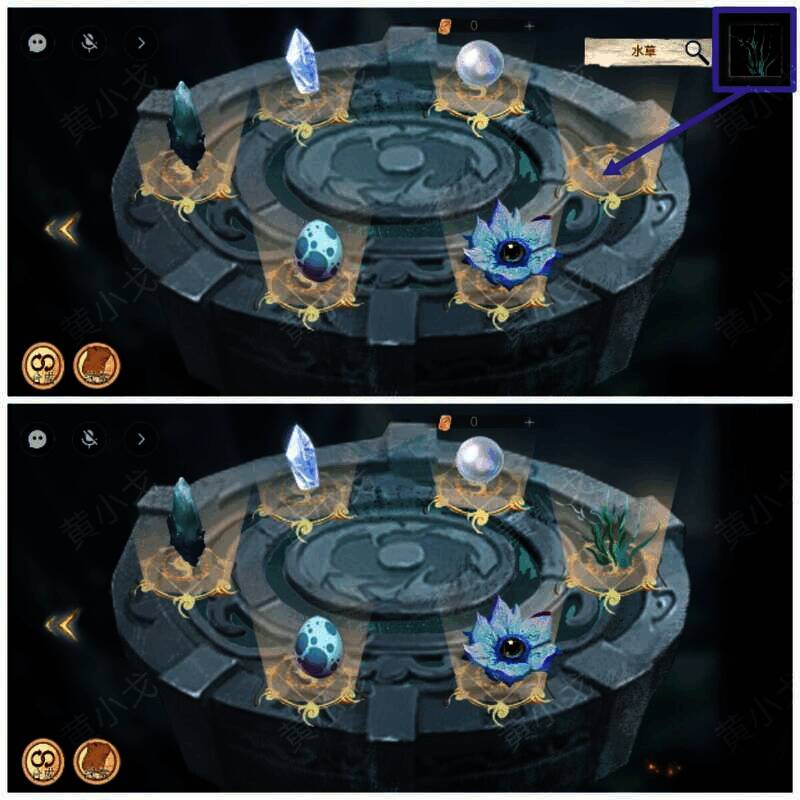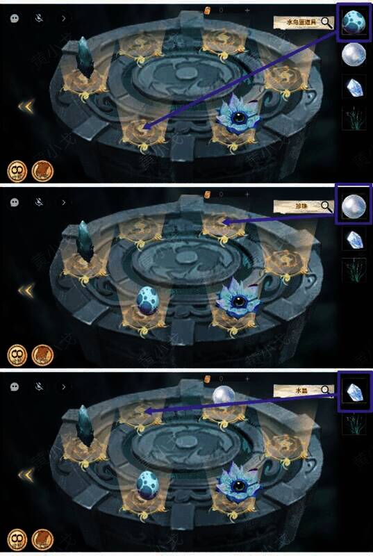 12.点击祭台,放上【水晶石】、【眼球植物】、【水鸟蛋道具】、【珍珠】、【水晶】和【水草】