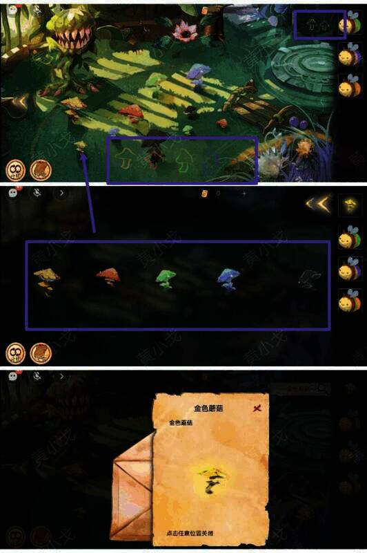 5.点击石壁上的蘑菇图案,草地上显现蘑菇(黄红绿紫黑);点击地上的蘑菇,根据显现的蘑菇,按(黄红绿紫黑)的顺序排列蘑菇;获得【金色蘑菇】