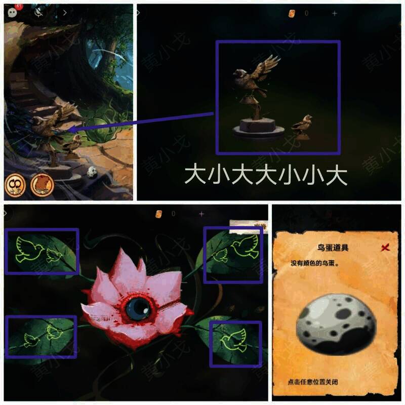 8.点击鸟雕像,根据迁瞳花叶子上的鸟图案,按(大小大大小小大)的顺序点击鸟雕像,获得【鸟蛋道具】