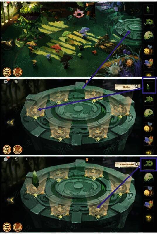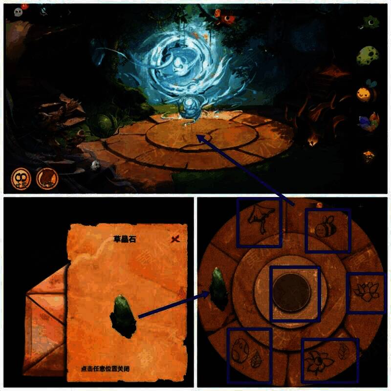 12.点击地上的罗盘,将罗盘调整到蘑菇、蜜蜂、五色花、花➕叶子、蛋➕叶子后,点击中间的罗盘按钮后获得【草晶石】(根据需要收集的6种物品调整对应的图案)