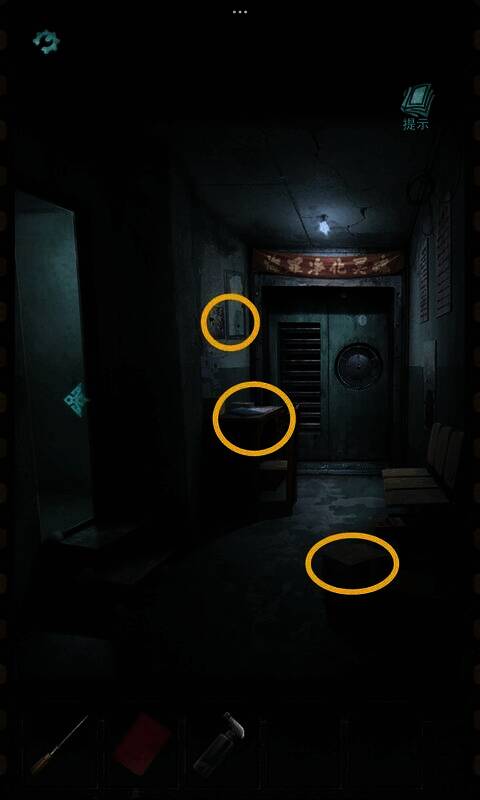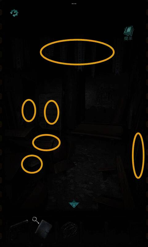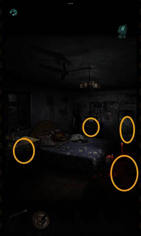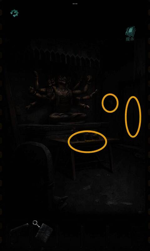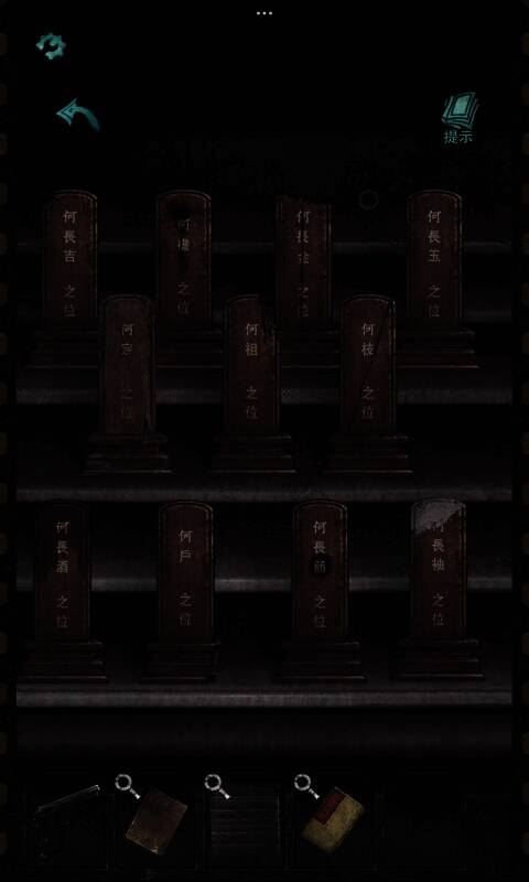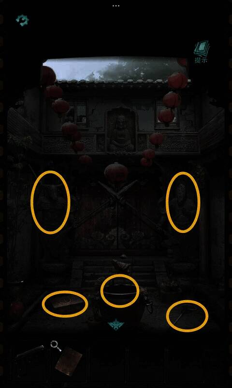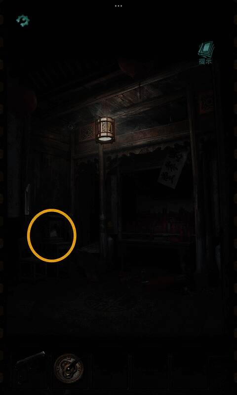 3、进入祠堂→点击左边桌子放上蜡烛过游戏获得【排位】(建议跳过)点击蒲团获得【磁针】回到天井放入水缸根据上红下白方向记住八卦图(随机生成),回到祠堂,点击蒲团打开机关获得【族谱】,火盆夹走灰烬玩拼图游戏使用胶带获得【一页纸】,回到天井点击天空记住线索,再回到祠堂放上排位,重新放排位进入密道