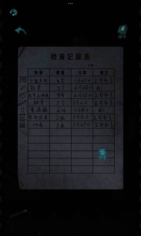 打开并进入储藏室→点击桌子拉开抽屉获得【铅笔】,根据物资记录表得知箱子密码(随机生成,数量和备注的总和)获得【玉佩】,点击左边纸箱,向上拉出盘子获得【电源线】