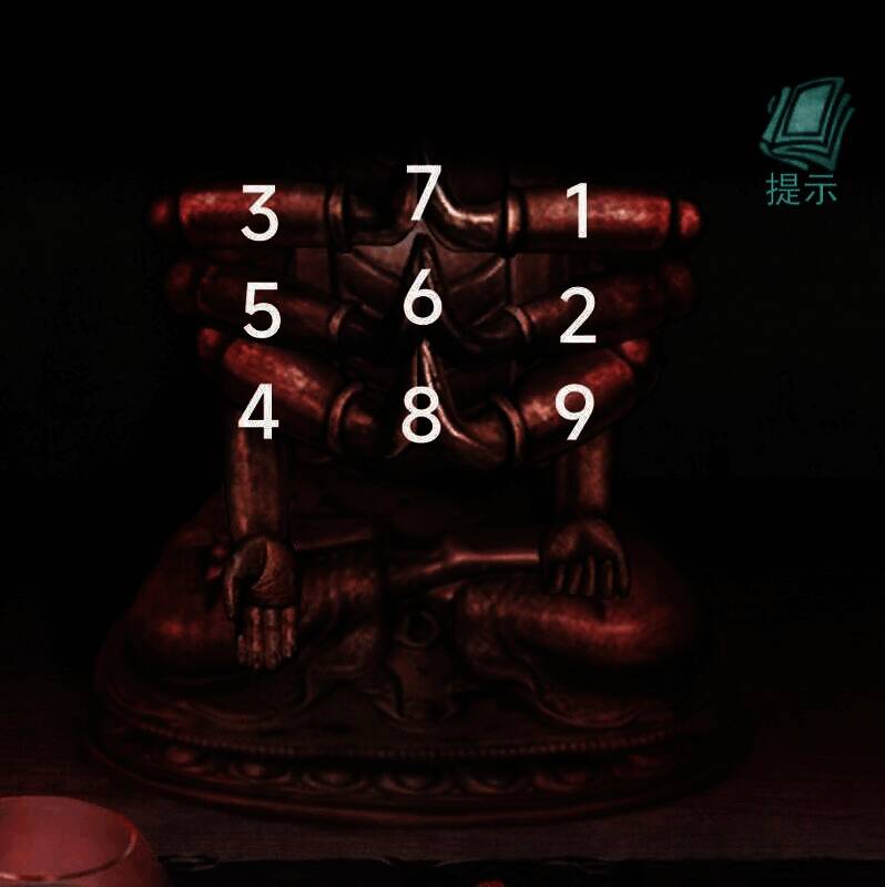 5、上山顶→点击莲花灯放上金属小人,观察亮灯顺序,点击佛像上的圆盘,根据亮灯顺序打开机关看到宝箱,根据姓名石条下方彩色点打开宝箱(长寿无极)获得【镶嵌物】前往乱葬岗,在棺材上放上镶嵌物点击村长手链进入下一章。
