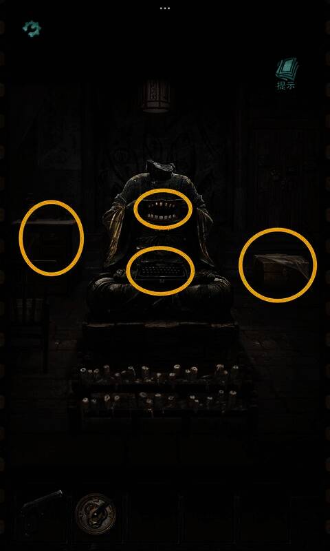 进入密室→点击打字机记住白黄条顺序,按照黄白条顺序点击山神牙齿,获得【钥匙】,用钥匙打开右侧木箱获得【火柴】查看符号本,点击左侧柜子拉开抽屉看到蜡烛和符号密码,根据符号本和符号密码推出抽屉锁密码(随机生成),打开抽屉获得木牌得到线索【EFOQ】,用火柴点燃蜡烛获得【燃烧的蜡烛】,用打字机打出密码线索EFOQ获得卡纸,用燃烧的蜡烛熏卡纸,并得到【铁片】,将铁片放入山神嘴巴,获得【卷轴】,进行对话(注意高能)