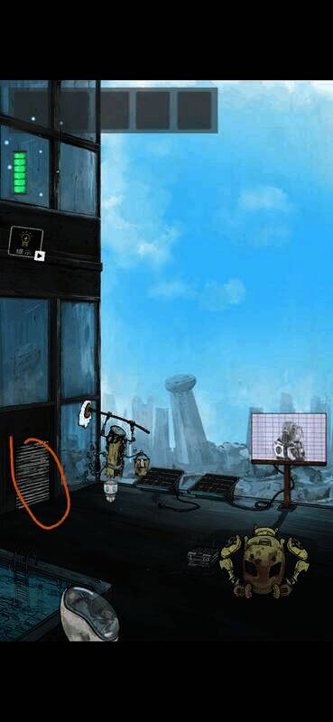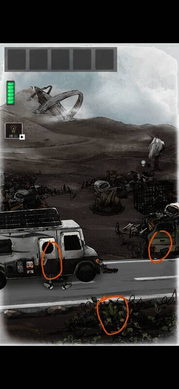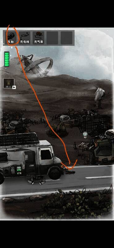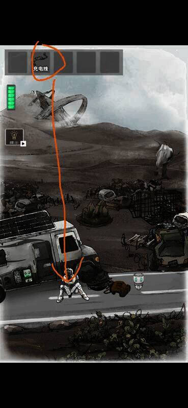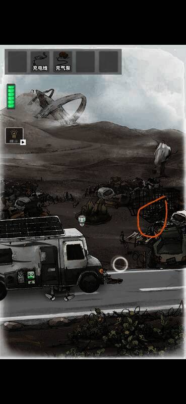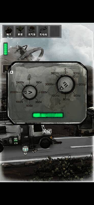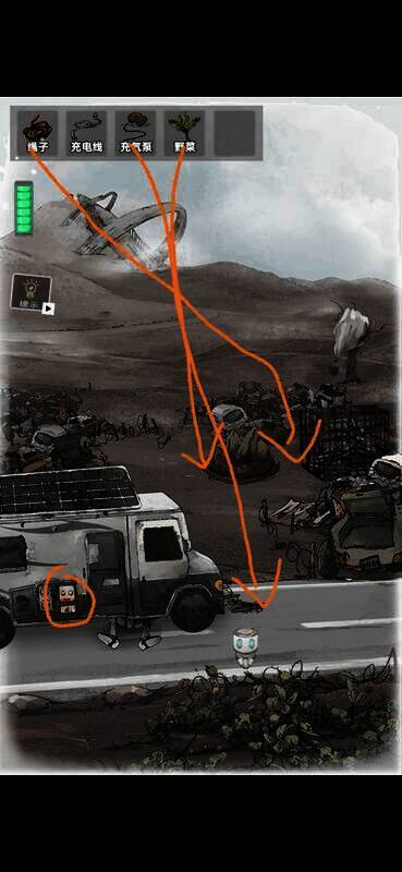 点击车后备箱得到绳子,点击菜地得到野菜,进入车内,点击得到充电线和充气泵,点击墙上机器人图纸得到提示启动数据为2000 120