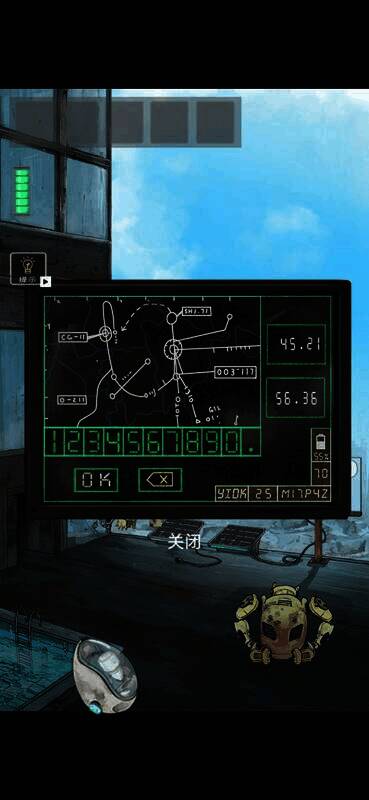 把钢轨架在沟上,越过去拿到数据盘安装在女机器人身上,通过聊天得知坐标31.2 121.5,再从机器人手中拿到通行证,刷过通行证后打开大门进入第二场景