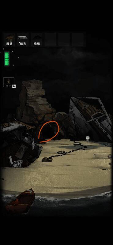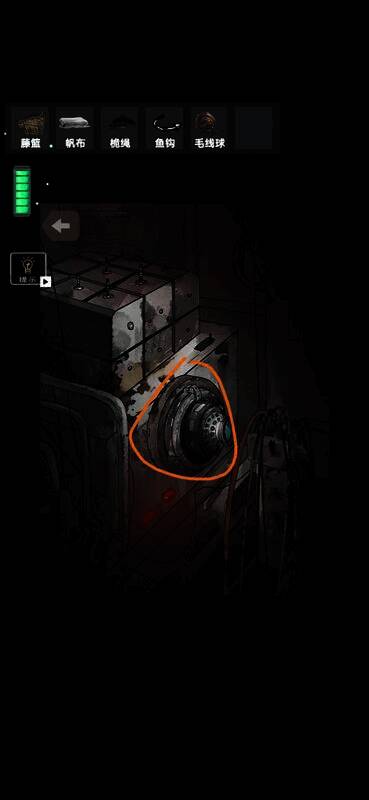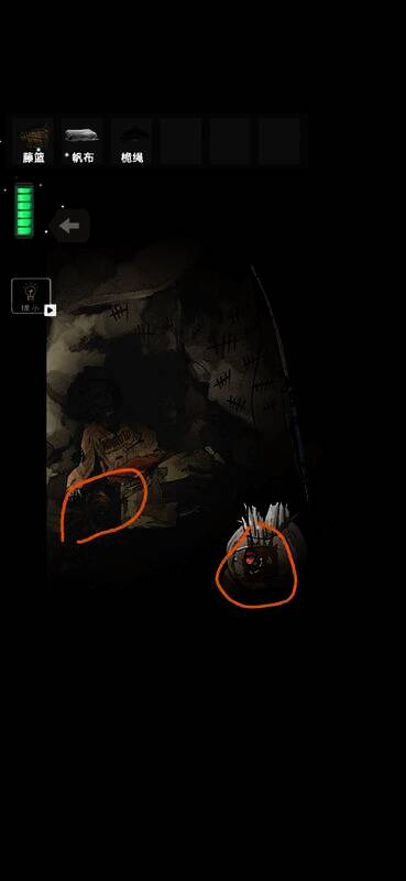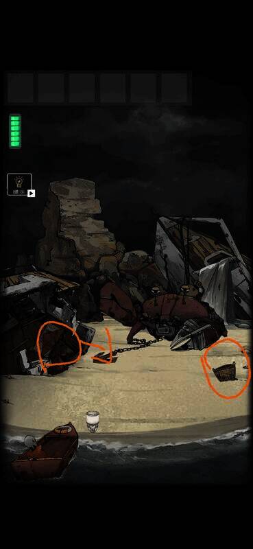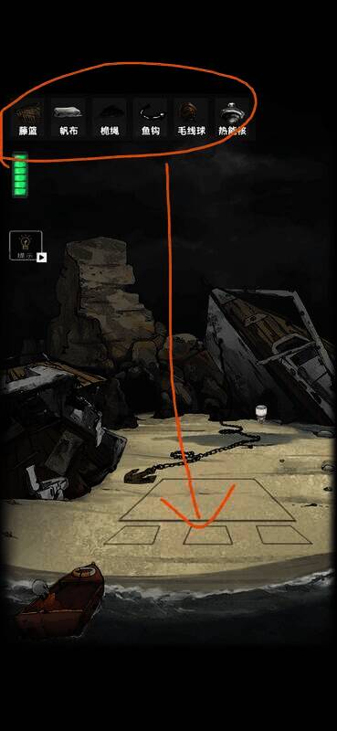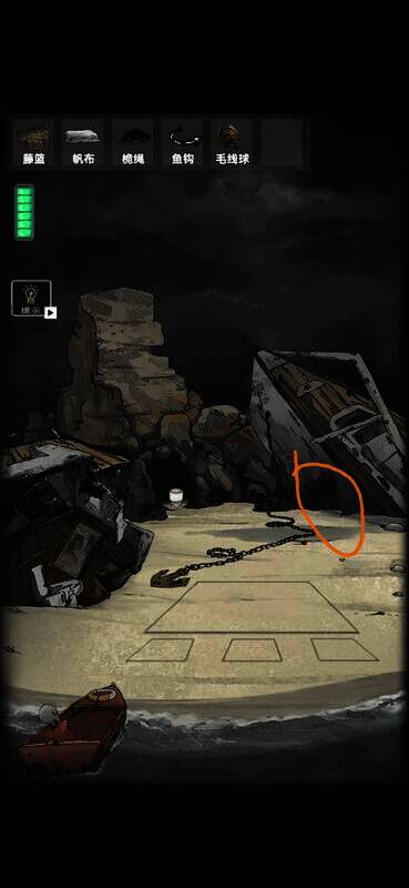 点击拿到篮子和风筝,把风筝挂在铁钩处赶走螃蟹,点击得到绳子和布,进入左边洞口点击得到鱼钩,毛线球