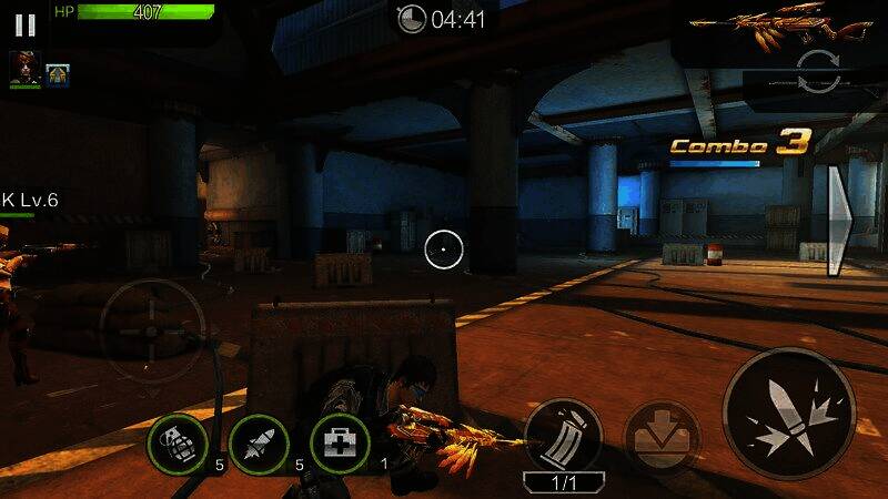 虚拟摇杆是视觉移动的关键,配合下方的道具按键和右下方的射击键,玩家可专注精准地击杀敌人。右上方能清晰看到更换枪支的图标,可利用不同枪支击退敌人。
