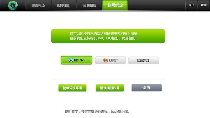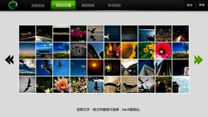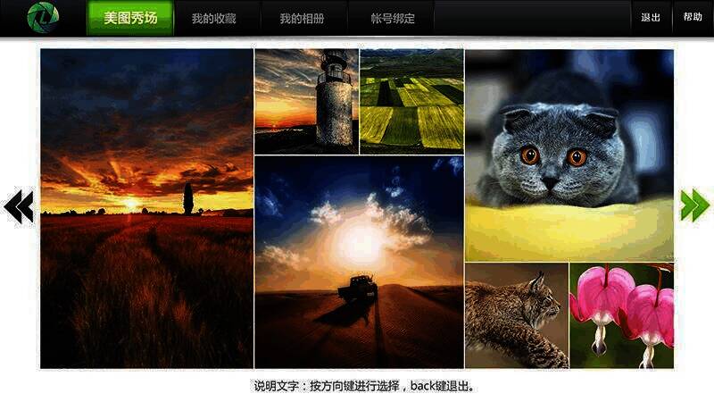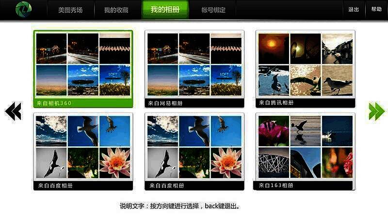 能将云端相册及手机相册同步到 TV 端,实现大屏、清晰、色彩艳丽的相片浏览与欣赏。可收藏美图并分享到主流社交平台。主要功能模块有美图秀场、我的收藏、我的相册、账号绑定。