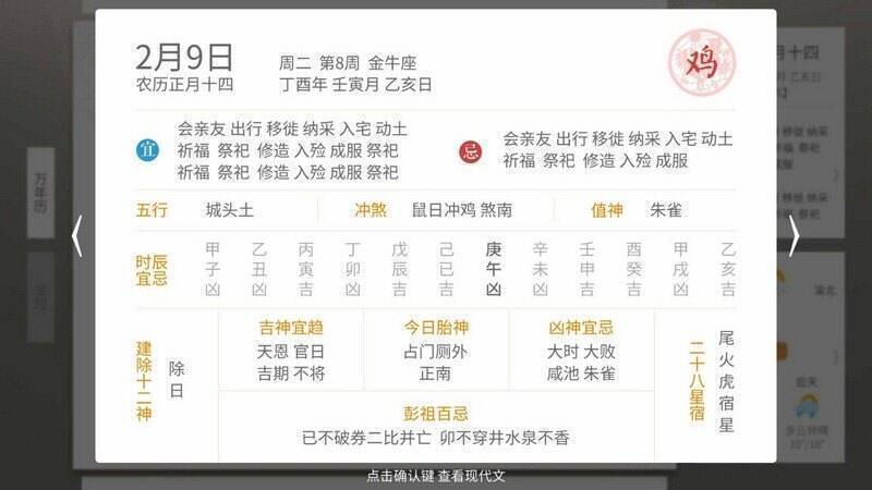 3、升级了黄历功能,除每日宜忌外,还能查看五行、冲煞、吉神宜趋、凶神宜忌、今日胎神、彭祖百忌等专业黄历信息;