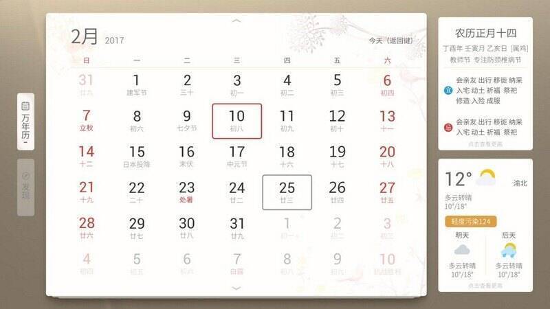 《万年历 TV版》是一款专注于用户时间管理的实用工具软件。它功能丰富,涵盖传统阴历、黄历宜忌、节日等便民信息,为用户带来诸多便利。这款软件由万年历官方出品,作为App Store热门日历应用,精心打造出适合智能电视的版本,保留精髓的同时给予独特体验,通过遥控器就能把挂历、时钟、晴雨表装进智能电视(盒子),还有实时天气预报助力出行。