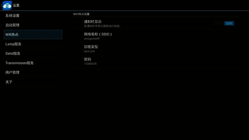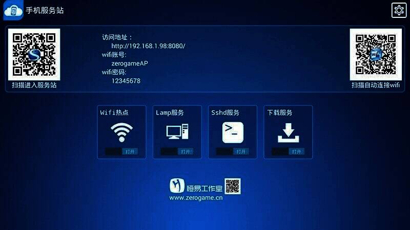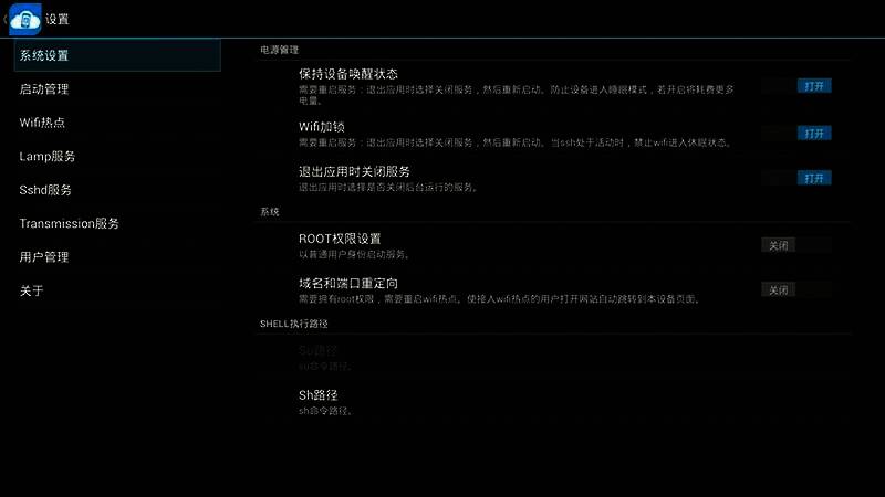 一个apk集成wifiAp、lamp、ssh、bt,专为盒子设计,无需root权限,运行后自动启动。具备自动开启wifi热点,把盒子当简单无线路由器;安装lighttpd、php、mysql作为小型服务器,预装owncloud私有云和drupal 7内容管理系统;安装ssh方便高级客户操作盒子等功能。