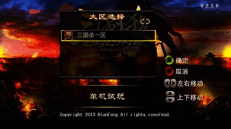 三国杀官方为ZNDS网友适配,完美支持遥控器操作。无需注册,按遥控器就能快速进入单机模式。操控方式有遥控器上下左右键,也可用空鼠。该游戏由杭州边锋网络技术有限公司开发,基于桌游《三国杀》,集角色扮演、战斗、伪装等要素。玩家扮演不同身份角色,在颠覆的三国舞台用技能击败对手。它取材三国历史,用户超一亿,受白领、大学生喜爱。