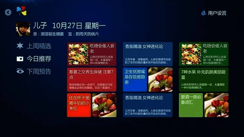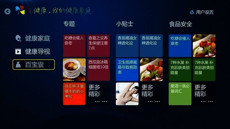 《乐健康》是专门为智能电视定制的应用,它从家庭不同成员的角度考量,综合每个人的生活、饮食和身体健康状况,以图文并茂和视频的形式,每天为不同家庭成员推荐科学合理的饮食、运动和作息建议,还会根据天气、气候变化对衣着、出行给出预警提示。