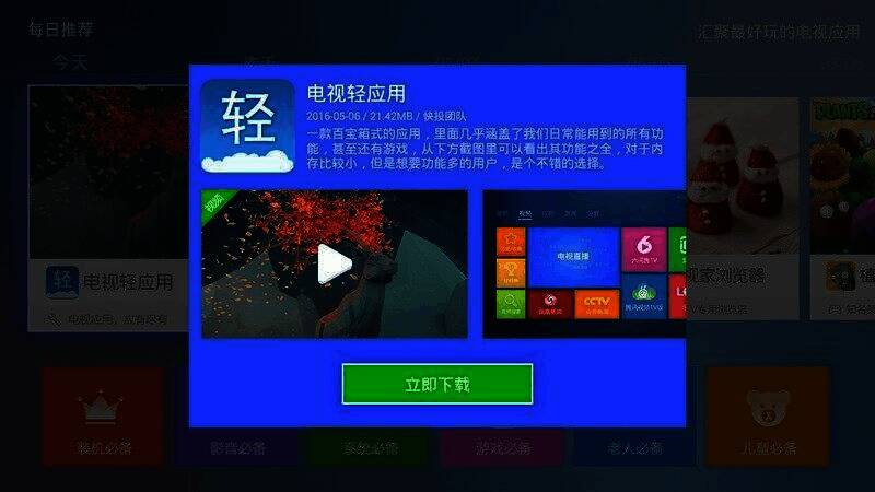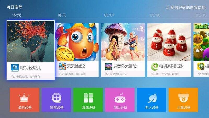 每日推荐精品电视应用,汇聚众多好玩应用。还有装机、影音、系统、游戏、老人、儿童六大特色必备分类,让您轻松找到精品、优质、必备的电视软件。