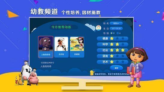 2、客厅幼教频道:家长完善宝宝信息、五大领域培养目标及观看时长后,该频道会推送最适合孩子的幼教动画。