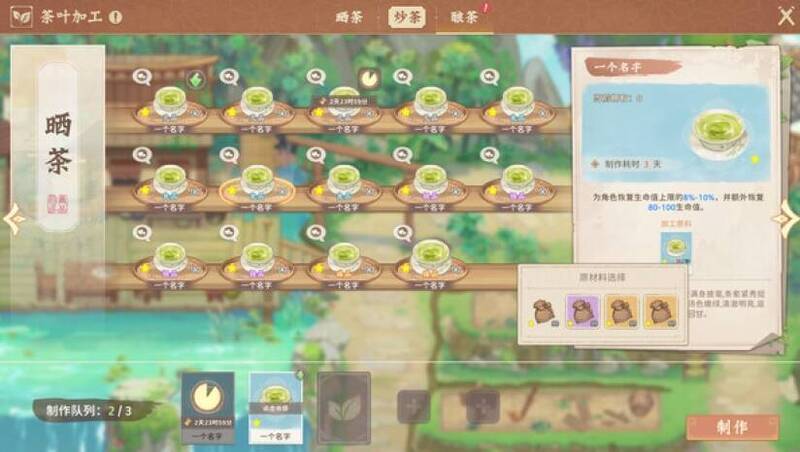 游戏从开垦荒地、修复水车起步,玩家可以种植各类作物、养殖牲畜,通过制茶、酿酒、烹饪传统美食等方式实现自给自足。茶园系统支持独立经营,玩家能够解锁晒茶、炒茶等工艺,还可以邀请友人一同品茗赏月,享受惬意时光。