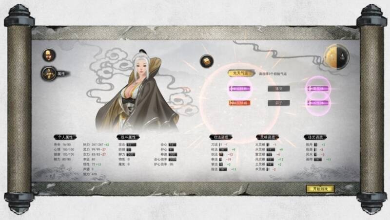 角色的属性包括个人属性,如寿命、心情、体力、灵力,以及战斗属性、功法资质、灵根资质和技艺资质等。