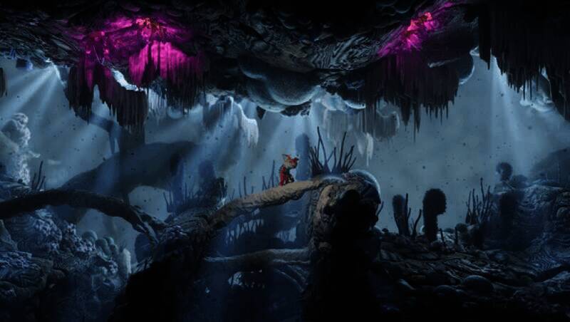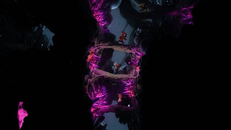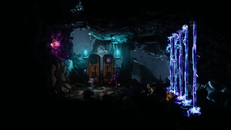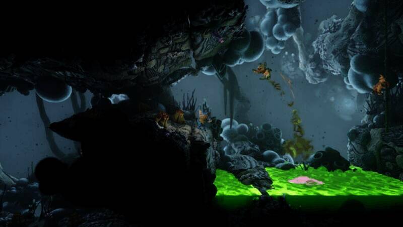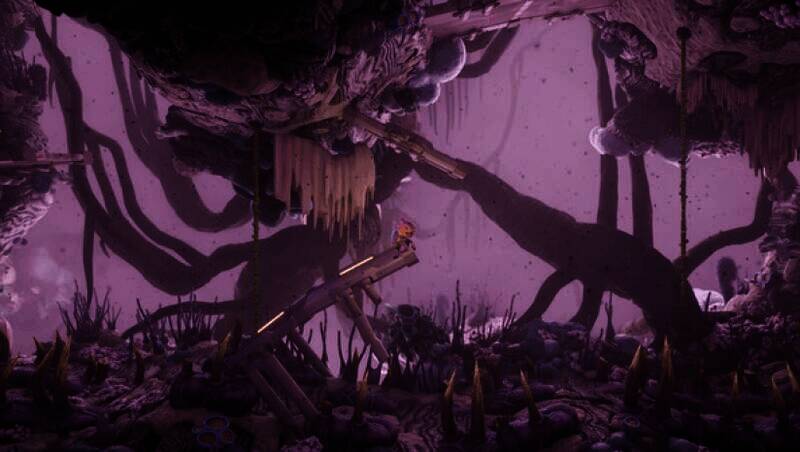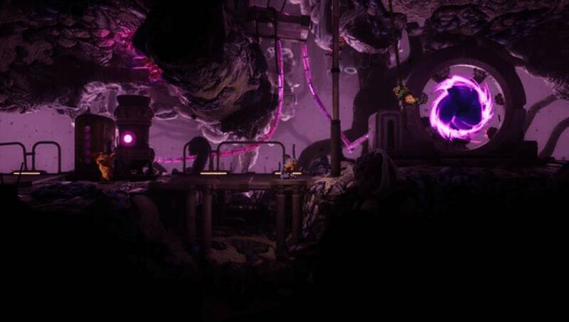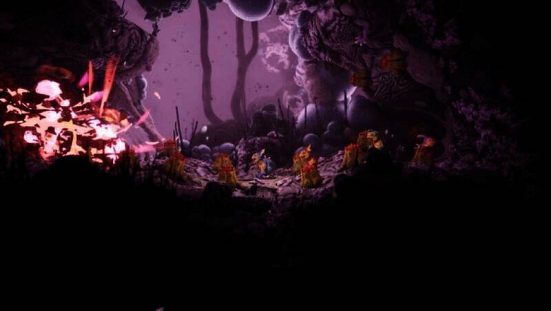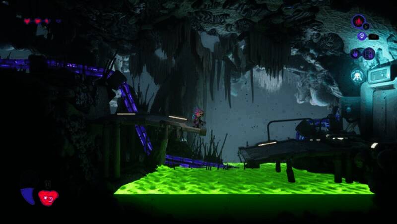 游戏采用虚幻5引擎打造,呈现出高饱和卡通风格。荧光苔藓覆盖的洞穴与机械残骸相互交织,营造出独特的赛博朋克美学。角色动作流畅自然、细腻生动,攀爬时肢体变形与技能释放的粒子特效充满了卡通张力,像黏液喷射的黏稠轨迹和火焰灼烧的动态光影都十分逼真。场景交互细节丰富,被摧毁的装置会喷发电浆,坠落的石块能够砸晕敌人。电子音效与动态配乐会随着探索节奏而变化,营造出科技感与荒诞感并存的沉浸式氛围。