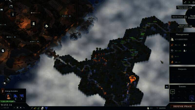 每局战役的地形和事件随机生成,例如突袭的狼群、限时资源宝箱等。“旗帜选择”系统提供阶段性增益,“神谕事件”让玩家在挑战更强敌人获取高回报和降低建造成本之间做抉择,促使玩家不断优化策略。