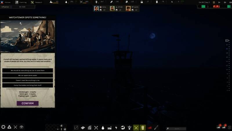 在广阔的海洋中探索,搜寻各类资源。同时,管理幸存者殖民地,平衡工程师、水手和工人等不同阵营的需求。工程师能操作起重机,水手擅长船只导航,利用他们的技能高效采集资源和管理物流。比如派水手出海寻找稀有材料,让工程师操作设备加工。