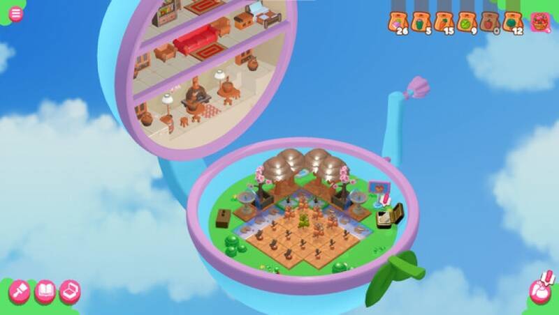 游戏采用手绘插画风格,色彩明快柔和,植物与家具设计充满童趣细节。动态光影和植物生长动画赋予场景生命力,如摇动摇把时花瓣飘落、藤蔓攀爬效果。配合轻快音效与治愈系配乐,营造沉浸式童话氛围,让玩家置身魔法玩具微观世界。
