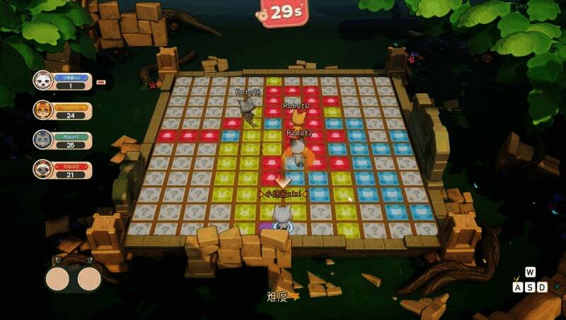 玩家扮演小猫咪,在“喵喵喵森林”与其他玩家或AI角色进行追逐和策略对抗,游戏融合了大富翁、捉迷藏、策略对抗与合作挑战等玩法。