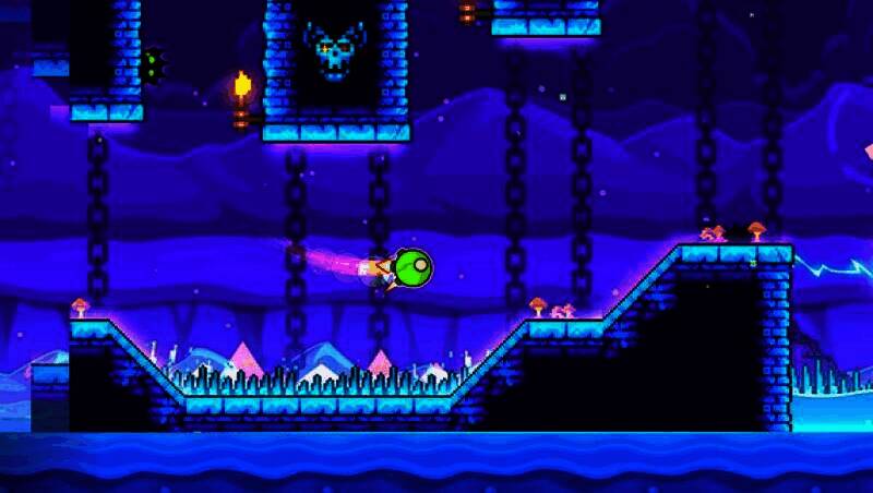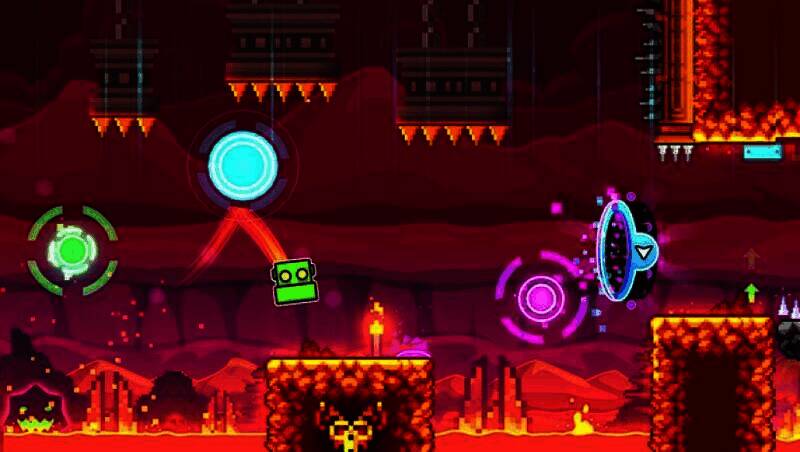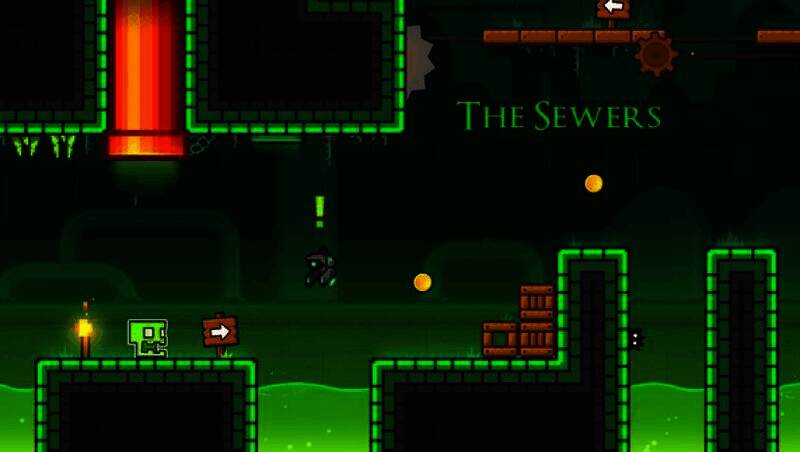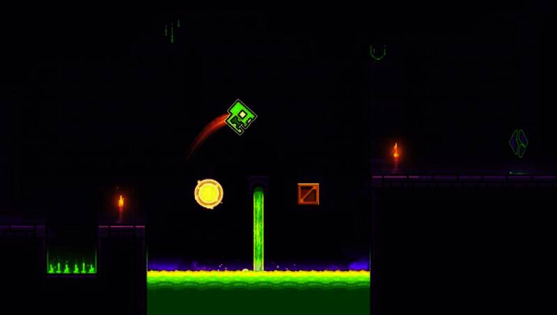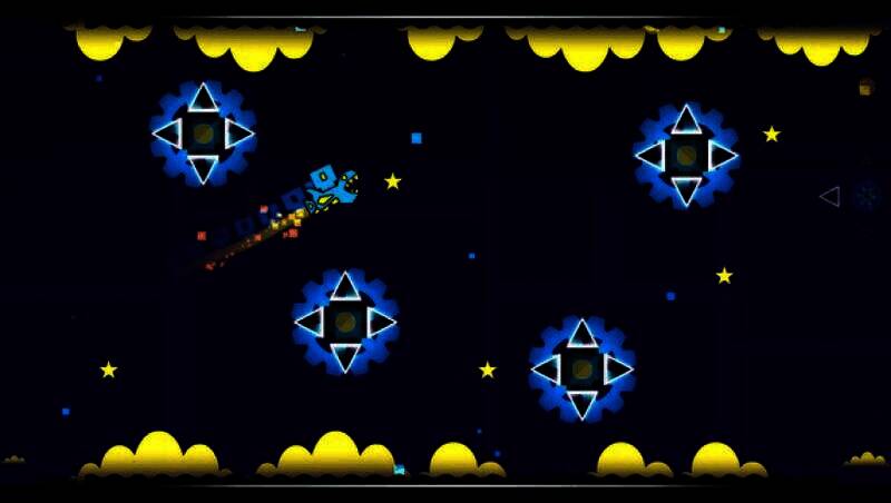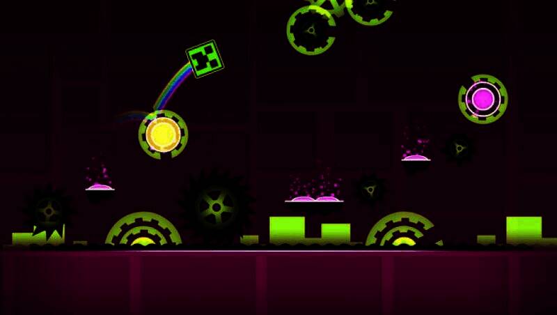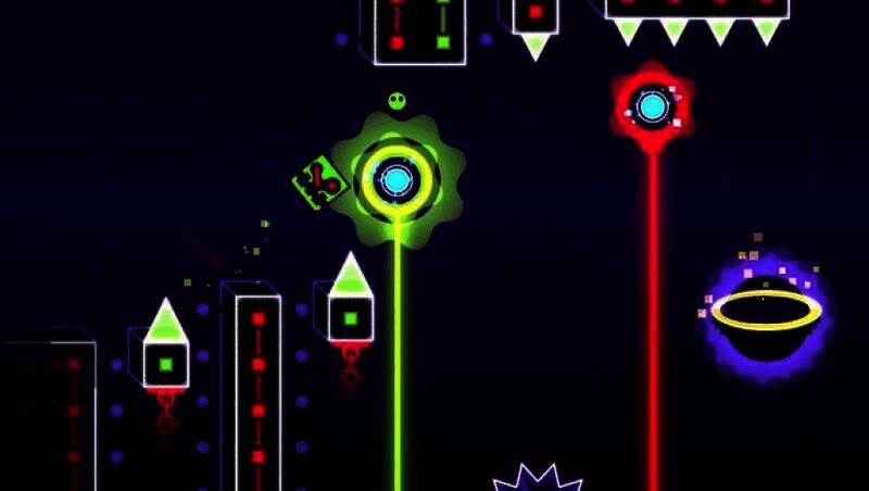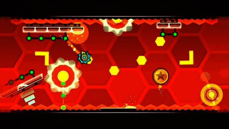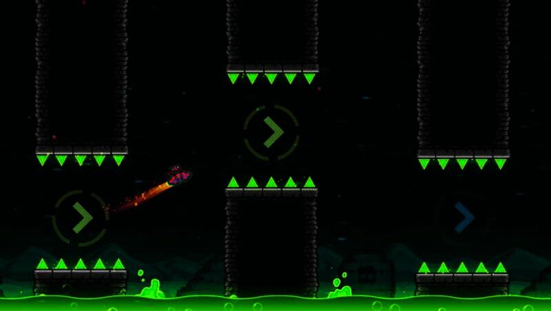 玩家通过跳跃、飞翔、翻转等动作控制角色前进,关卡中有尖刺、锯片、狭窄通道等障碍物,需把握时机和节奏躲避,安全到终点。