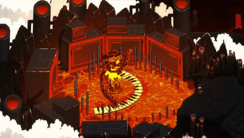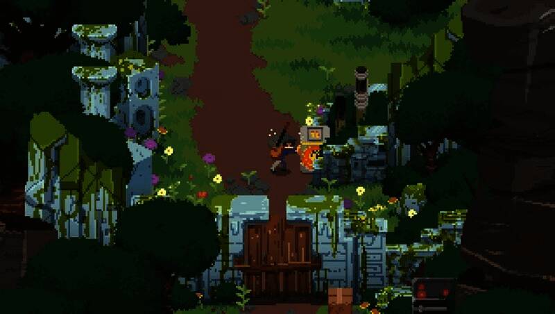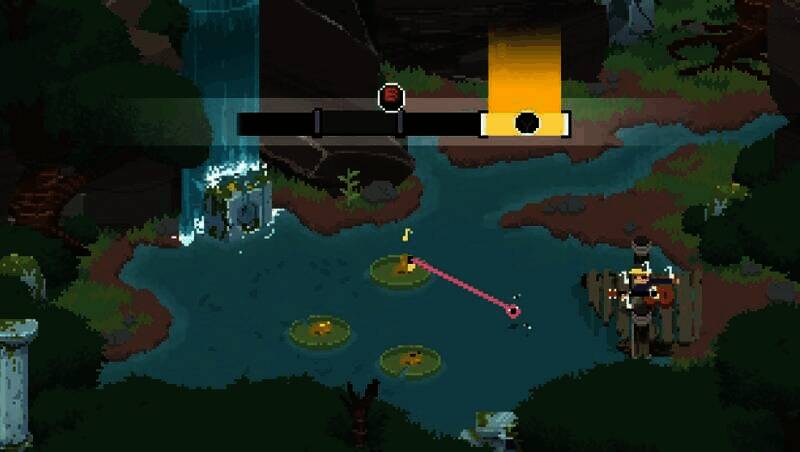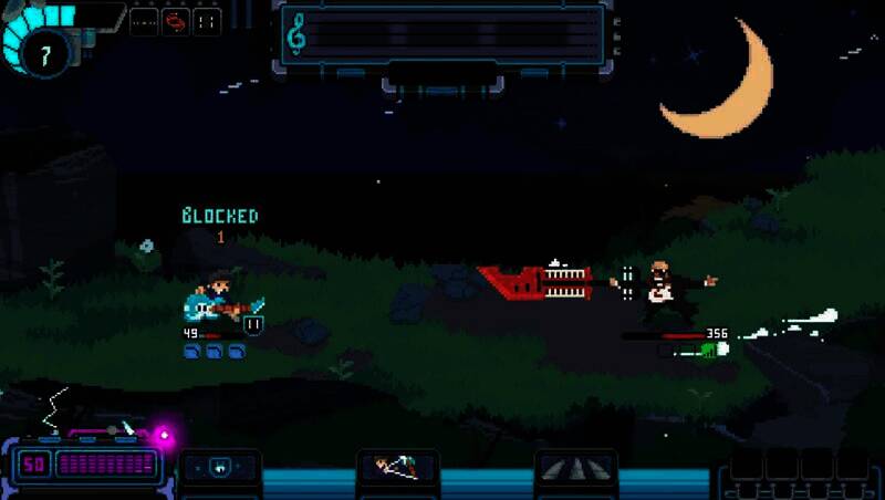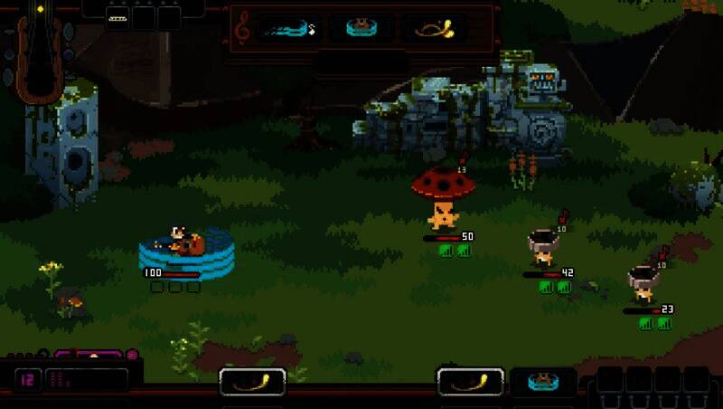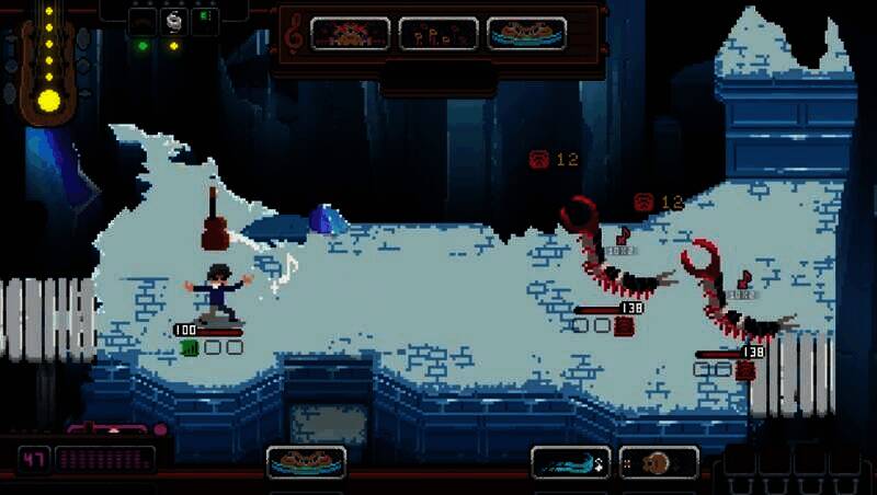 游戏采用2.5D像素美术风格,场景设计充满音乐元素,岩石随节拍震动、植物化作音符跳跃。战斗特效以夸张的霓虹色块和动态粒子呈现,如电吉他攻击时的电流波纹与鼓点爆炸。角色与Boss造型融入蒸汽朋克与金属摇滚美学,如机械齿轮镶嵌的贝斯、扬声器组成的怪物躯体,搭配复古滤镜和镜头抖动效果,强化战斗的节奏张力。