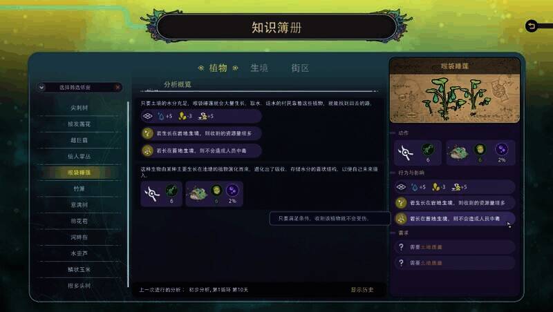 “知识手册”会随探索不断更新,为玩家提供行动指南。例如发现新植物后可解锁对应种植技术,优化粮食生产。