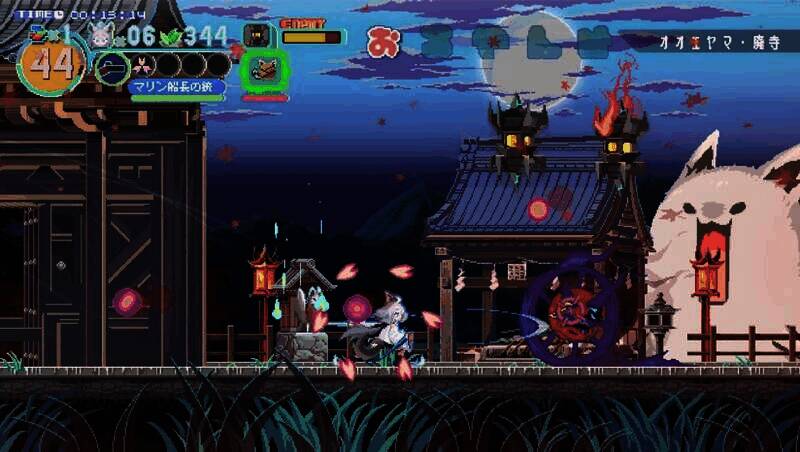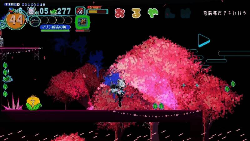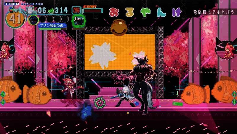 游戏采用复古像素风格,通过动态光影和精细动画展现现代感。角色动作帧数充足,如白上吹雪的剑技特效、墙壁跳跃的残影效果,凸显高速战斗的张力。场景设计从和风建筑到赛博都市,每个关卡都通过色彩搭配和像素细节营造独特氛围。BOSS战演出视觉冲击力强,如宝钟玛琳的“状态异常”攻击以夸张的像素粒子效果呈现,契合hololive成员的虚拟偶像特质。