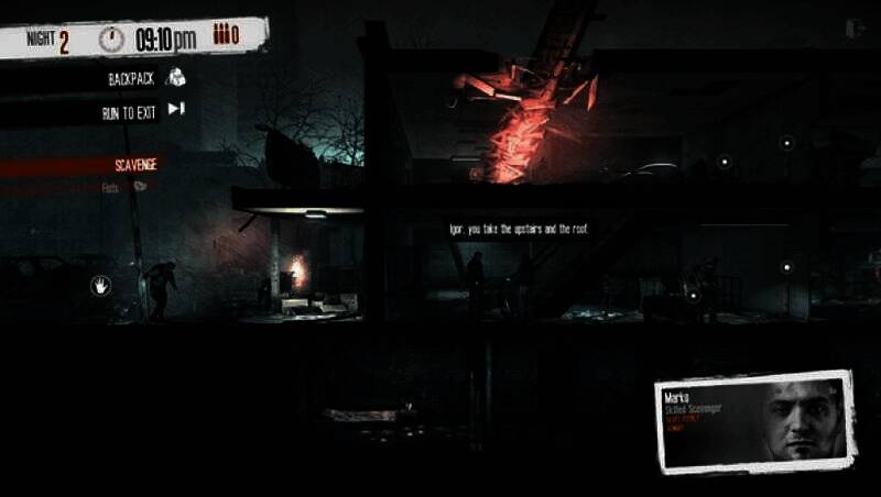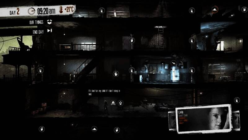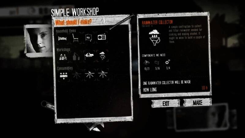 在游戏进程中,玩家操控的平民群体处于被围攻的城市,资源匮乏,危险四伏。游戏以日夜循环的节奏推进,白天,避难所外有狙击手阻拦,玩家需专注于避难所的维护,如锻造物品、开展交易、照顾幸存者等;夜晚,则可带领一名同伴到一系列独特场所搜集生存物资。