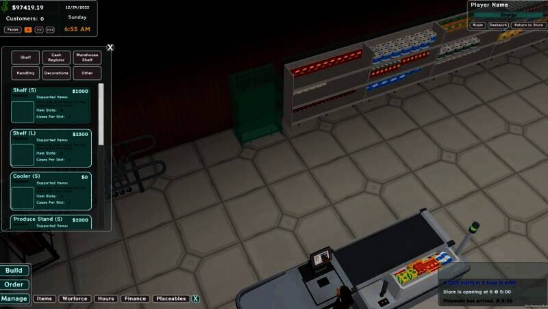 玩家还能购买各类可放置物品,如收银机、货架、冷藏柜、冷冻柜、农产品货架、购物车围栏、购物篮架、物料搬运设备和装饰品等。