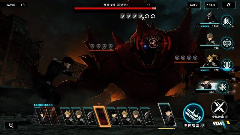 2、场景设计:从废墟城市到防卫队基地,场景细节丰富,怪兽BOSS的体积与破坏特效带来强烈视觉压迫感。