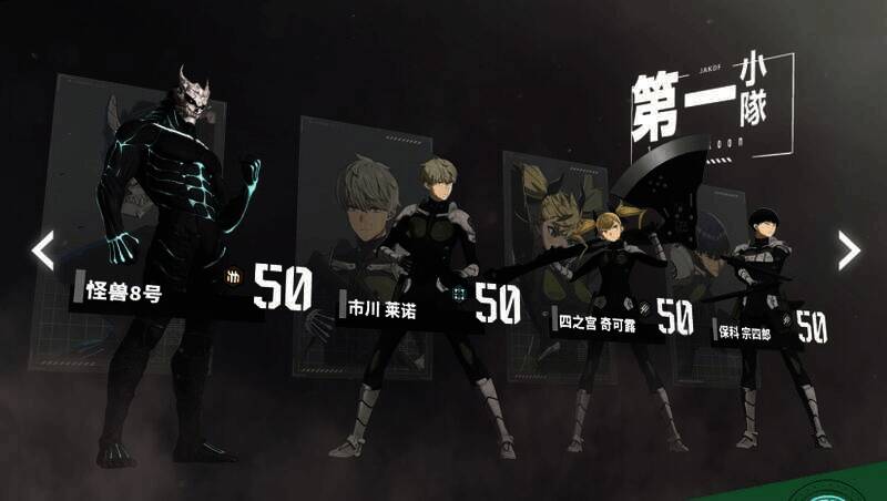 1、角色养成:玩家可操控包括怪兽8号、亚白米娜、市川雷诺等原作人气角色,每个角色都有独特必杀技和成长路线。