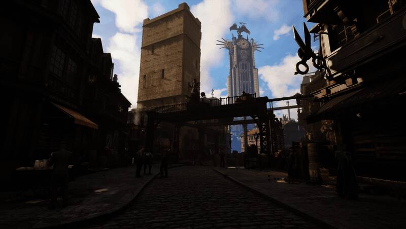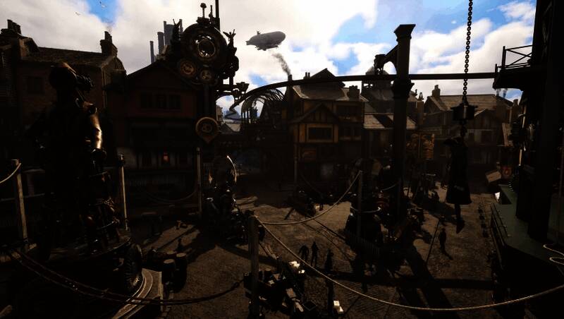 游戏运用虚幻引擎打造,营造出层次分明的蒸汽朋克美学。动态光影与粒子特效让时间旅行场景更具特色,穿越时空中有撕裂的金属碎片与齿轮漩涡,现世也会因玩家的选择产生即时的环境变迁,如工厂废墟变为图书馆,这些都以高精度细节呈现。