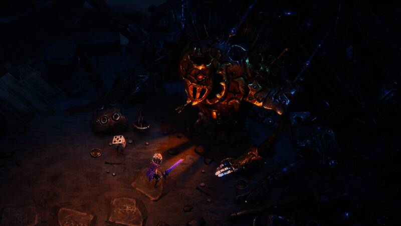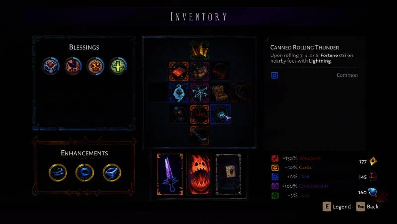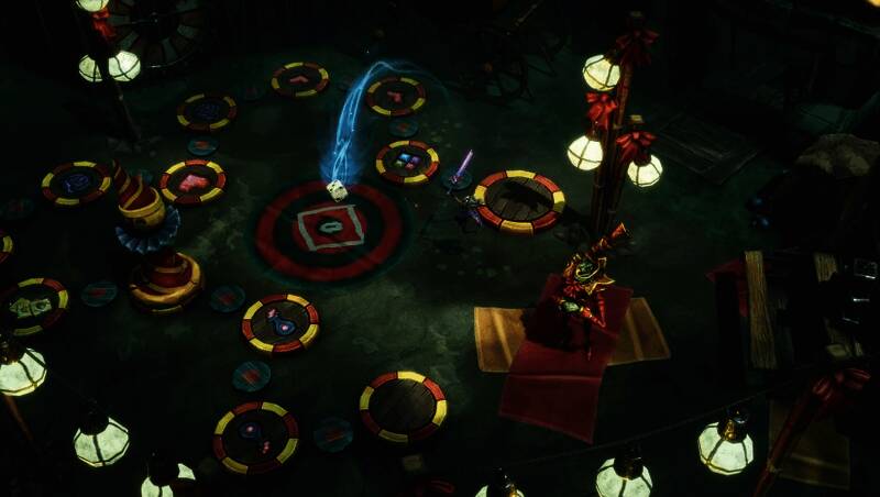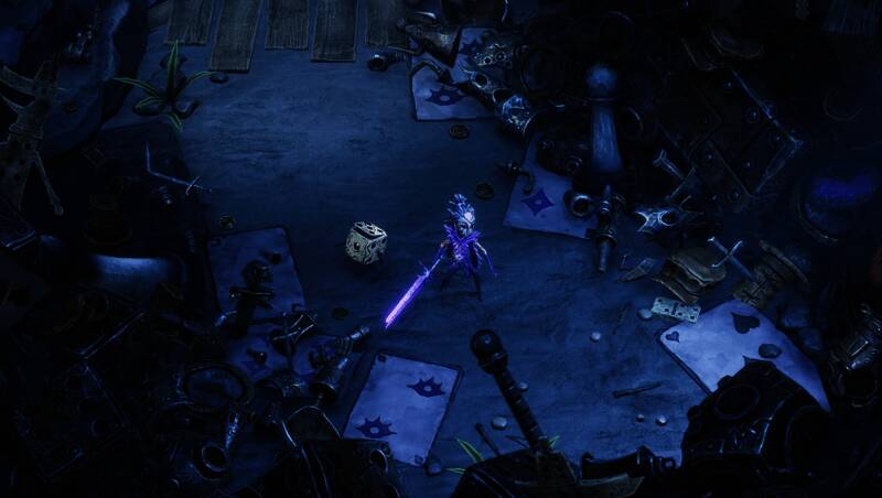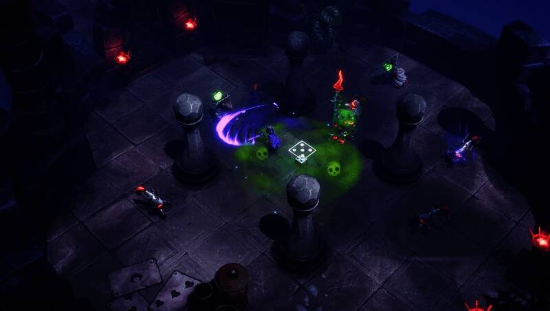 游戏采用快节奏的动作Roguelite玩法,玩家可使用四种不同风格的武器,包括近战斧、远程弓等,并结合超过100种圣物与15种卡牌技能,打造属于自己的战斗流派。骰子机制贯穿整个游戏过程——投掷结果可能带来增益、资源补给,也可能触发高风险赌博事件,考验玩家的决策能力与胆量。