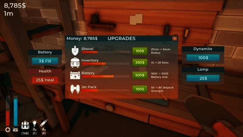 利用金币对装备进行升级,以此提升采矿效率。随着游戏进程的推进,玩家能够购买更高级的铁锹、探测器等装备。