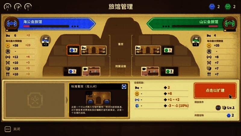 游戏操作相对简单,玩家通过放置设施、选择策略等方式经营旅馆,即便没玩过经营类游戏的玩家也能快速上手。