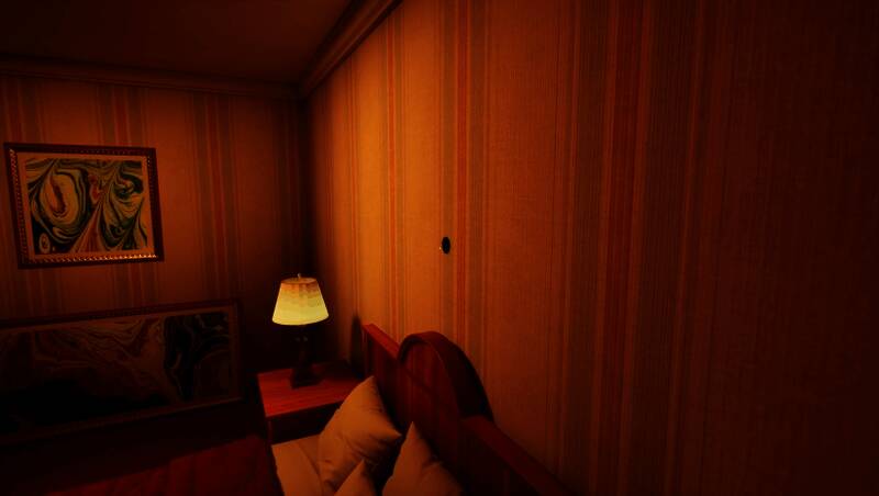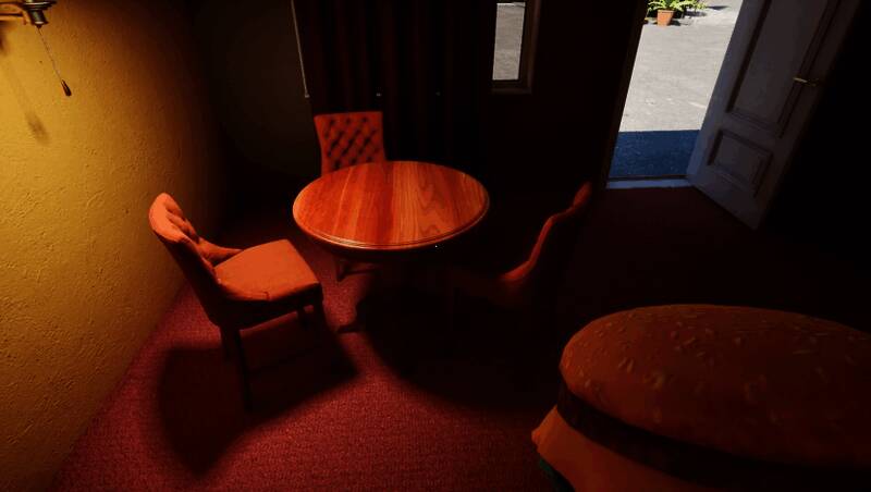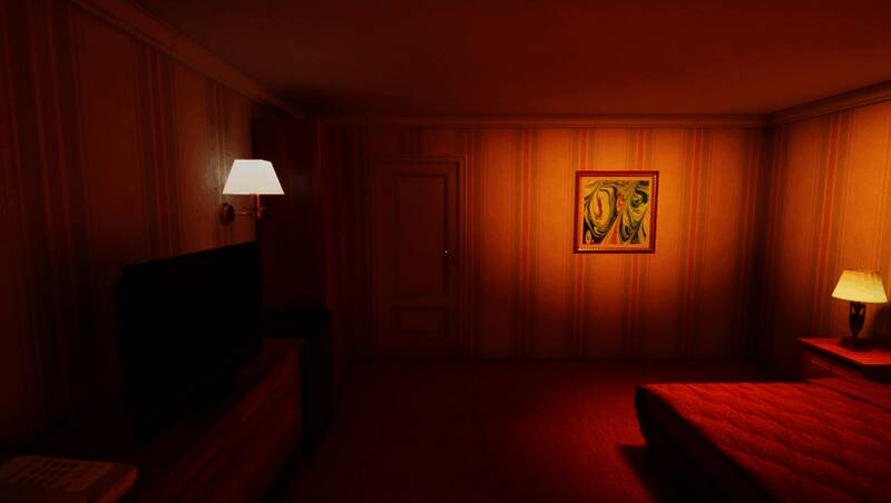 游戏采用复古VHS录像带风格的画面呈现方式,包括雪花纹、色彩偏移与动态模糊效果,完美还原上世纪80年代低成本恐怖片的视觉氛围。墙壁纹理随着剧情推进发生微妙变化,如指纹浮现与霉斑扩散,配合光影扭曲效果,进一步强化“现实崩坏”的感受。角色建模同样注重细节,例如礼宾员僵硬的微笑、房客影子与动作不同步的设计,都暗示着非人本质的存在。