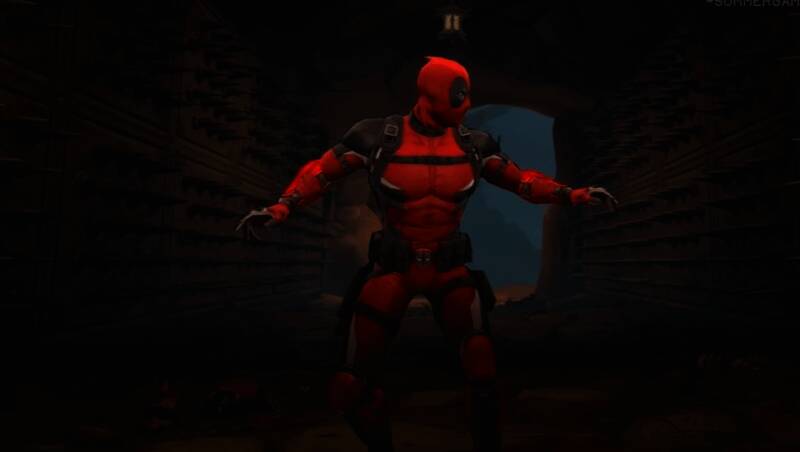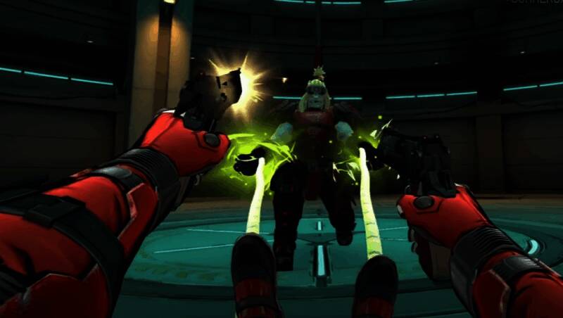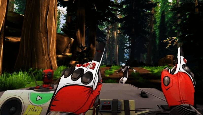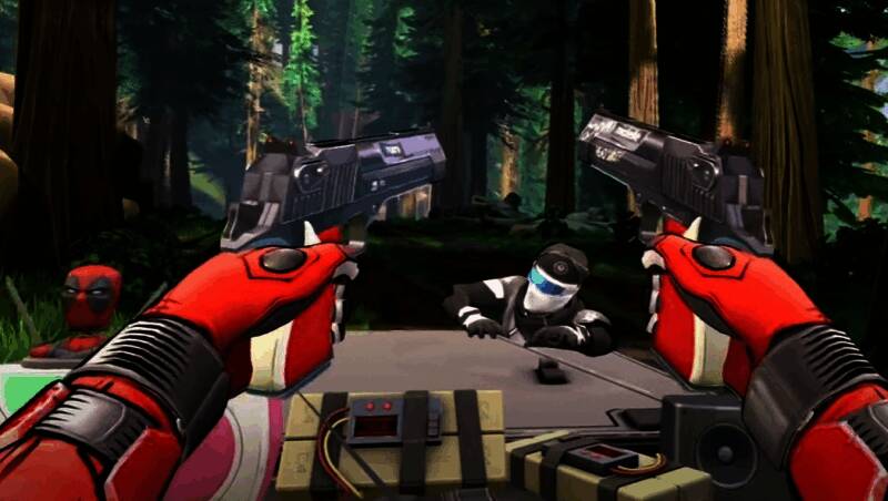 游戏画面呈现鲜明的美漫画风,角色模型精细展现死侍紧身衣质感,场景设计融合异星荒漠与电视节目舞台元素,通过光影对比营造出强烈的荒诞氛围。VR技术的应用进一步强化暴力美学,无论是旋转刀片的血腥处决还是爆炸特效,都以第一视角带来前所未有的沉浸感。