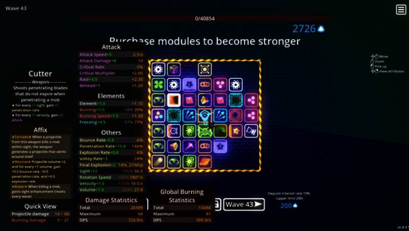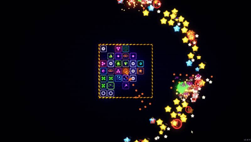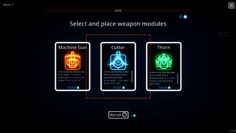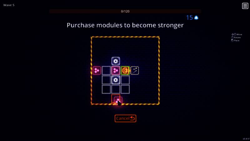 敌人如潮水般不断涌来,目标是摧毁你的防线。为了应对这一威胁,你必须从商店中选择适合的模块——包括武器、增益效果和词缀词条,并将它们合理地部署在战场的格子中。每个模块都有其生效范围,因此如何布局、优化组合成为胜负关键。