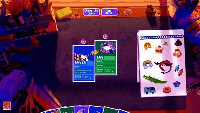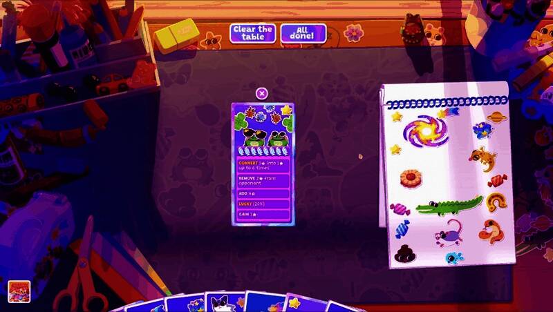 游戏拥有三大核心特色:首先是创意贴纸组合与深度策略,支持无限可能的牌组构建,并设计有“贴纸协同效应”,特定组合可触发隐藏效果;其次是Roguelike随机事件与每日挑战,任务内容每日更新,包含限时对战、谜题解谜与神秘商店抢购等;最后是自由养成与社交互动,玩家可通过收集贴纸、完成任务解锁“贴纸册”,并参与本地与在线对战,与好友切磋技艺,加入俱乐部争排名。
