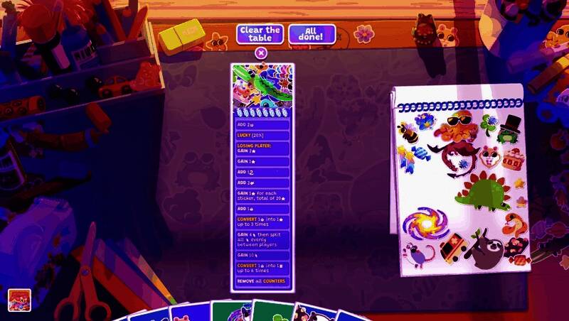 游戏采用清新明快的卡通美术风格,色彩鲜艳、细节丰富,贴纸卡牌动态特效生动有趣。角色与场景设计充满生活气息,UI简洁直观,战斗界面采用分屏模式便于观察局势。音效与粒子特效增强了沉浸感,出牌时伴随翻页声与光影变化,特殊效果如“火山喷发”会带来全屏震动与逼真音效。此外,玩家还可通过成就系统解锁个性化牌背与边框,打造专属视觉风格。